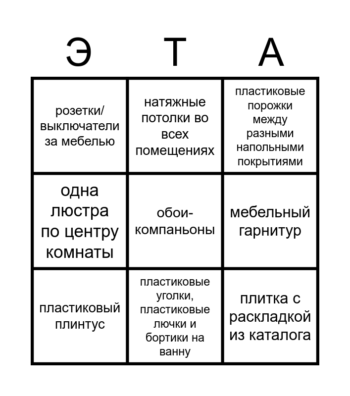 This bingo card has 9 words: пластиковый плинтус, пластиковые порожки между разными напольными покрытиями, натяжные потолки во всех помещениях, одна люстра по центру комнаты, розетки/выключатели за мебелью, мебельный гарнитур, обои-компаньоны, плитка с раскладкой из каталога and пластиковые уголки, пластиковые лючки и бортики на ванну.