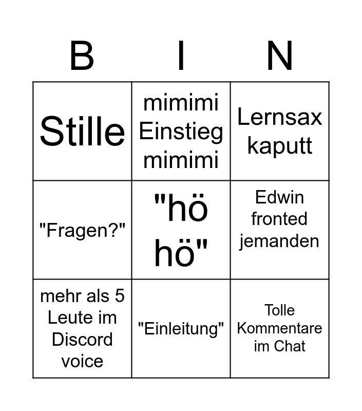 This bingo card has 11 words: Internetausfall, "hö hö", Tolle Kommentare im Chat, mehr als 5 Leute im Discord voice, mimimi Einstieg mimimi, Lernsax kaputt, "Fragen?", jemand stört während Präsentation, Edwin fronted jemanden, Stille and "Einleitung".