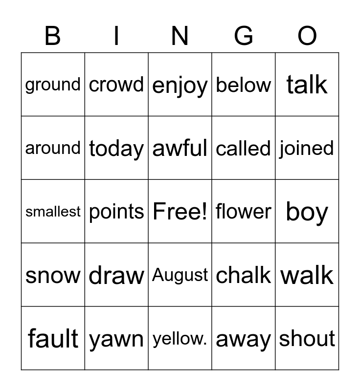 This bingo card has a free space and 24 words: draw, yawn, awful, fault, talk, ground, around, crowd, flower, August, called, smallest, chalk, walk, today, away, boy, enjoy, joined, points, shout, snow, below and yellow..
