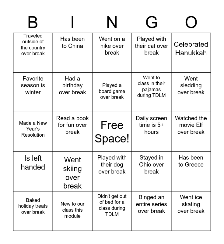 This bingo card has a free space and 24 words: Went skiing over break, New to our class this module, Played a board game over break, Baked holiday treats over break, Celebrated Hanukkah, Traveled outside of the country over break, Favorite season is winter, Has been to China, Daily screen time is 5+ hours, Played with their dog over break, Went to class in their pajamas during TDLM, Made a New Year's Resolution, Stayed in Ohio over break, Has been to Greece, Had a birthday over break, Binged an entire series over break, Watched the movie Elf over break, Went on a hike over break, Went sledding over break, Read a book for fun over break, Went ice skating over break, Is left handed, Played with their cat over break and Didn't get out of bed for a class during TDLM.