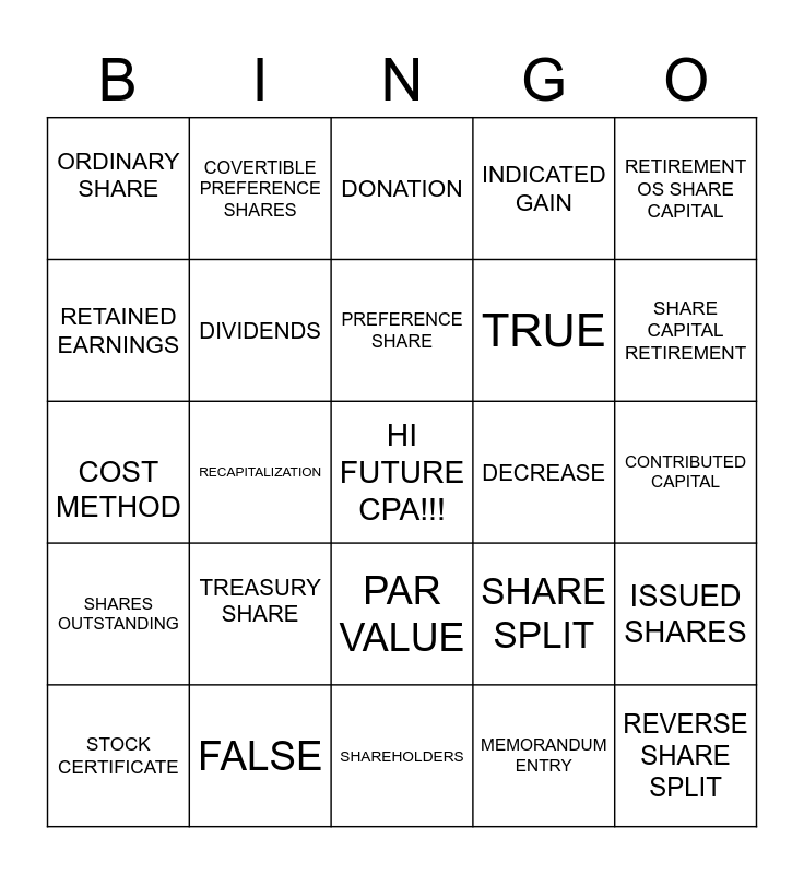 This bingo card has a free space and 24 words: TREASURY SHARE, FALSE, PREFERENCE SHARE, STOCK CERTIFICATE, RETIREMENT OS SHARE CAPITAL, ORDINARY SHARE, RETAINED EARNINGS, COVERTIBLE PREFERENCE SHARES, DECREASE, PAR VALUE, TRUE, COST METHOD, SHARE SPLIT, ISSUED SHARES, DIVIDENDS, MEMORANDUM ENTRY, CONTRIBUTED CAPITAL, DONATION, SHARE CAPITAL RETIREMENT, RECAPITALIZATION, REVERSE SHARE SPLIT, SHARES OUTSTANDING, INDICATED GAIN and SHAREHOLDERS.