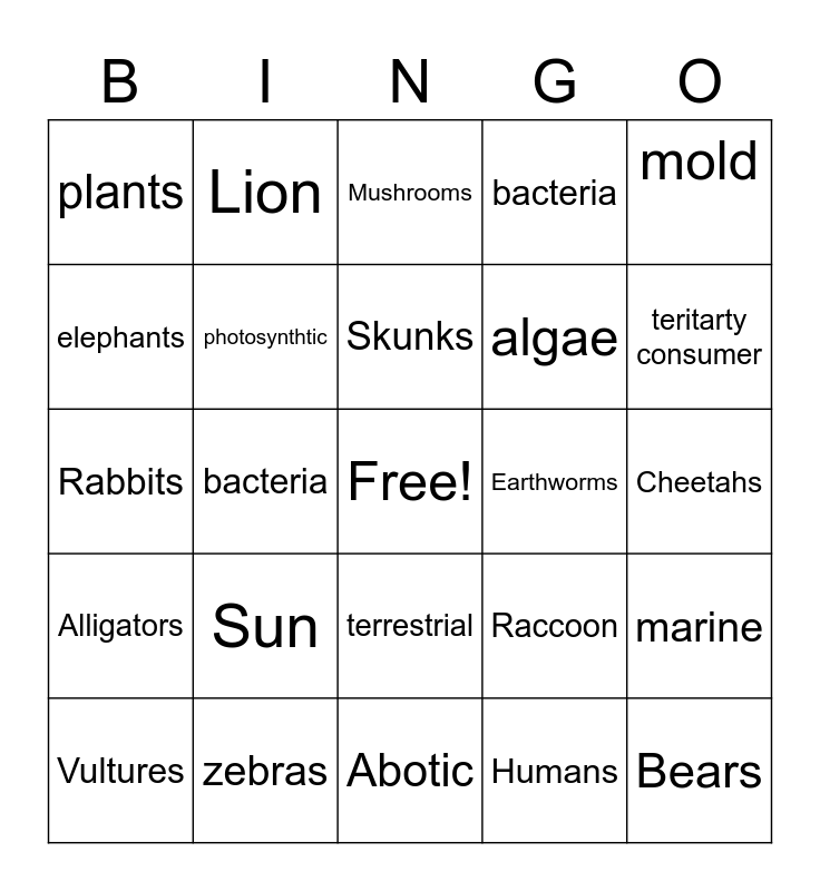This bingo card has a free space and 24 words: Sun, zebras, Skunks, Vultures, mold, plants, elephants, Lion, Earthworms, terrestrial, algae, Rabbits, Raccoon, marine, photosynthtic, Humans, Cheetahs, Mushrooms, teritarty consumer, bacteria, Bears, Alligators, bacteria and Abotic.