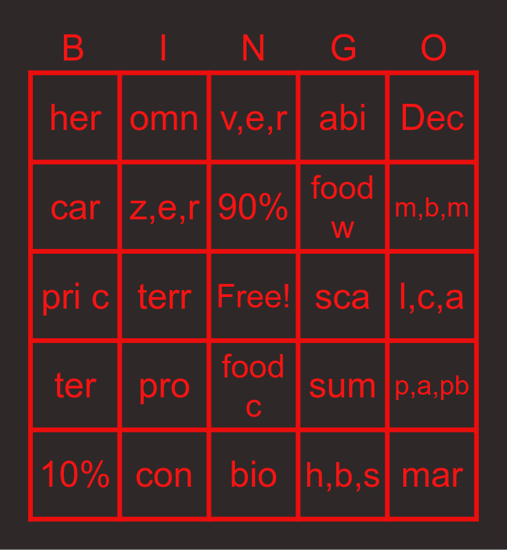 This bingo card has a free space and 24 words: pro, con, 90%, 10%, Dec, her, car, omn, sca, food c, food w, pri c, sum, p,a,pb, z,e,r, h,b,s, l,c,a, v,e,r, m,b,m, terr, mar, ter, abi and bio.