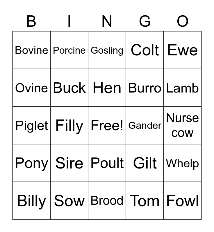 This bingo card has a free space and 57 words: Barrow, Billy, Boar, Bovine, Brood, Brood animal, Buck, Bull, Burro, Canine, Colt, Cow, Dam, Doe, Drake, Equine, Ewe, Filly, Foal, Fowl, Gander, Gelding, Gilt, Gosling, Heifer, Hen, Jack, Kid, Lamb, Litter, Mare, Mule, Nanny, Nonruminant, Nurse cow, Ovine, Pig, Piglet, Polled, Pony, Porcine, Poult, Poultry, Ram, Rooster, Runt, Sire, Sow, Stallion, Steer, Stud, Tom, Vealer, Weanling, Wether, Whelp and Yearling.