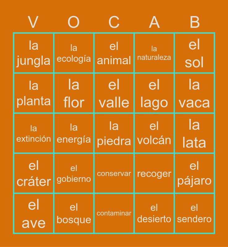 This bingo card has a free space and 59 words: el árbol, el bosque, el cielo, el cráter, el desierto, la estrella, la flor, la hierba, el lago, la luna, la naturaleza, la nube, la planta, el río, la selva, la jungla, el sendero, el sol, la tierra, el valle, el volcán, el animal, el ave, el pájaro, el gato, el perro, el pez, los peces, la vaca, el calentamiento global, el cambio climático, la conservación, la contaminación, la deforestación, la ecología, el ecologista, el ecoturismo, la energía, el envase, la extinción, la fábrica, el gobierno, la lata, la ley, el medio ambiente, el peligro, la población, el reciclaje, conservar, contaminar, cuidar, destruir, evitar, proteger, reciclar, recoger, respirar, renovable and respirar.