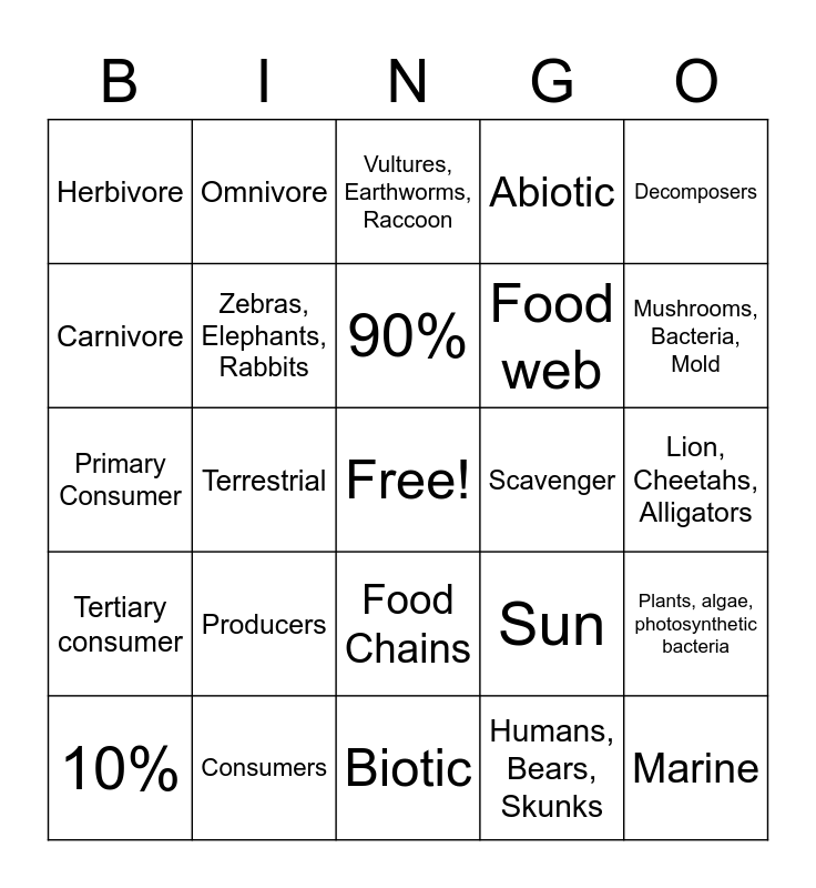 This bingo card has a free space and 24 words: Producers, Consumers, 90%, 10%, Decomposers, Herbivore, Carnivore, Omnivore, Scavenger, Food Chains, Food web, Primary Consumer, Sun, Plants, algae, photosynthetic bacteria, Zebras, Elephants, Rabbits, Humans, Bears, Skunks, Lion, Cheetahs, Alligators, Vultures, Earthworms, Raccoon, Mushrooms, Bacteria, Mold, Terrestrial, Marine, Tertiary consumer, Abiotic and Biotic.