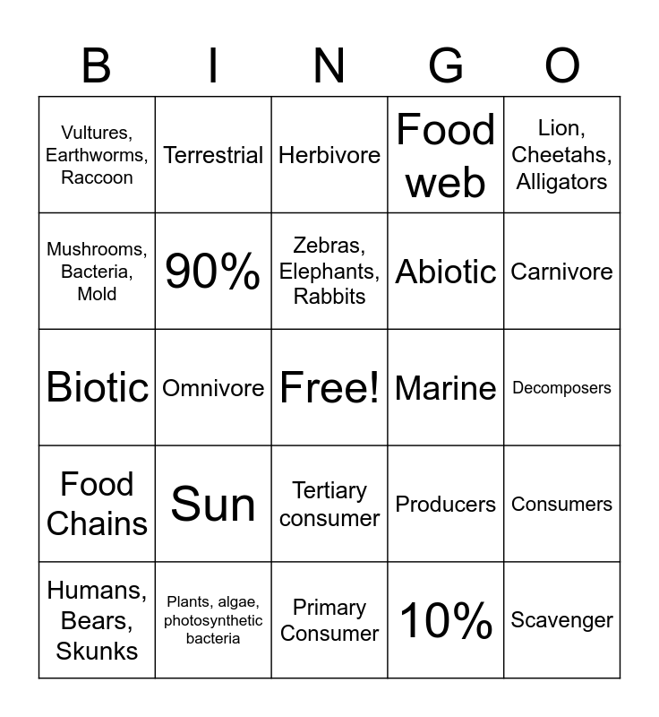 This bingo card has a free space and 24 words: Sun, Plants, algae, photosynthetic bacteria, Zebras, Elephants, Rabbits, Humans, Bears, Skunks, Lion, Cheetahs, Alligators, Vultures, Earthworms, Raccoon, Mushrooms, Bacteria, Mold, Terrestrial, Marine, Tertiary consumer, Abiotic, Biotic, Producers, Consumers, 90%, 10%, Decomposers, Herbivore, Carnivore, Omnivore, Scavenger, Food Chains, Food web and Primary Consumer.