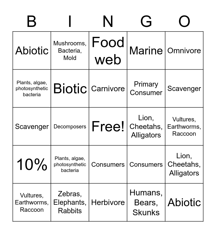 This bingo card has a free space and 48 words: Sun, Plants, algae, photosynthetic bacteria, Zebras, Elephants, Rabbits, Humans, Bears, Skunks, Lion, Cheetahs, Alligators, Vultures, Earthworms, Raccoon, Mushrooms, Bacteria, Mold, Terrestrial, Marine, Tertiary consumer, Abiotic, Biotic, Producers, Consumers, 90%, 10%, Decomposers, Herbivore, Carnivore, Omnivore, Scavenger, Food Chains, Food web, Primary Consumer, Sun, Plants, algae, photosynthetic bacteria, Zebras, Elephants, Rabbits, Humans, Bears, Skunks, Lion, Cheetahs, Alligators, Vultures, Earthworms, Raccoon, Mushrooms, Bacteria, Mold, Terrestrial, Marine, Tertiary consumer, Abiotic, Biotic, Producers, Consumers, 90%, 10%, Decomposers, Herbivore, Carnivore, Omnivore, Scavenger, Food Chains, Food web and Primary Consumer.