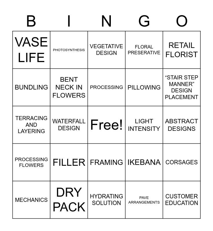This bingo card has a free space and 24 words: FILLER, DRY PACK, PROCESSING, MECHANICS, RETAIL FLORIST, VASE LIFE, BUNDLING, PHOTOSYNTHESIS, LIGHT INTENSITY, FRAMING, PILLOWING, TERRACING AND LAYERING, IKEBANA, CORSAGES, BENT NECK IN FLOWERS, PAVE ARRANGEMENTS, ABSTRACT DESIGNS, VEGETATIVE DESIGN, “STAIR STEP MANNER” DESIGN PLACEMENT, WATERFALL DESIGN, CUSTOMER EDUCATION, PROCESSING FLOWERS, FLORAL PRESERATIVE and HYDRATING SOLUTION.