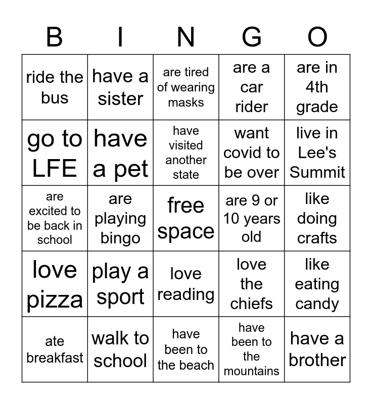 This bingo card has a free space and 24 words: play a sport, walk to school, have visited another state, ate breakfast, are in 4th grade, ride the bus, go to LFE, have a sister, are 9 or 10 years old, love reading, want covid to be over, are excited to be back in school, love the chiefs, like eating candy, have a pet, have been to the mountains, like doing crafts, are tired of wearing masks, live in Lee's Summit, are playing bingo, have a brother, love pizza, are a car rider and have been to the beach.