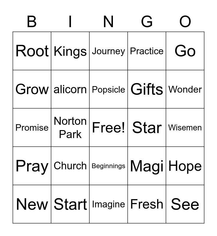 This bingo card has a free space and 26 words: Beginnings, Fresh, Popsicle, Start, Go, Root, Grow, Kings, Wisemen, Magi, Gifts, Promise, Hope, New, Norton Park, Family, Practice, Pray, Journey, See, Wonder, Imagine, Star, Church, alicorn and endless.