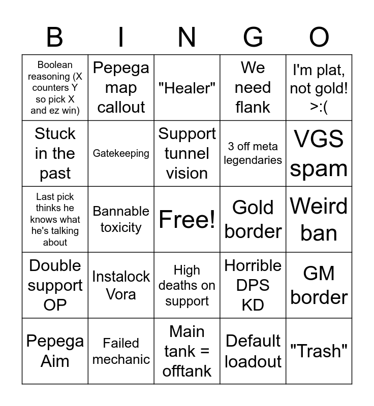 This bingo card has a free space and 24 words: Instalock Vora, Failed mechanic, Support tunnel vision, Pepega Aim, I'm plat, not gold! >:(, Boolean reasoning (X counters Y so pick X and ez win), Stuck in the past, Pepega map callout, Gold border, High deaths on support, 3 off meta legendaries, Last pick thinks he knows what he's talking about, Horrible DPS KD, GM border, Gatekeeping, Default loadout, Weird ban, "Healer", VGS spam, Bannable toxicity, "Trash", Double support OP, We need flank and Main tank = offtank.