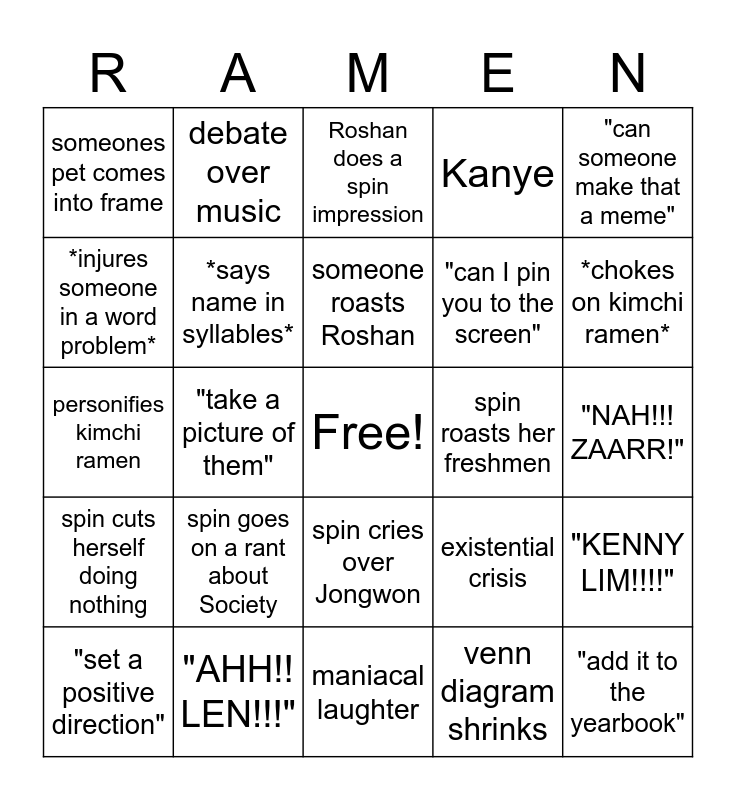 This bingo card has a free space and 24 words: spin goes on a rant about Society, "AHH!! LEN!!!", someone roasts Roshan, "set a positive direction", "can someone make that a meme", someones pet comes into frame, *injures someone in a word problem*, debate over music, spin roasts her freshmen, spin cries over Jongwon, "can I pin you to the screen", personifies kimchi ramen, existential crisis, "KENNY LIM!!!!", *says name in syllables*, venn diagram shrinks, "NAH!!! ZAARR!", Roshan does a spin impression, *chokes on kimchi ramen*, "take a picture of them", "add it to the yearbook", spin cuts herself doing nothing, Kanye and maniacal laughter.