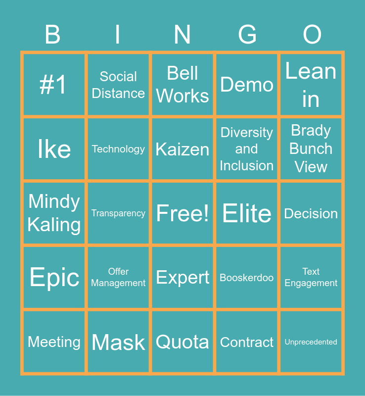 This bingo card has a free space and 161 words: Double click, Zoom Fatigue, Winter Release, INSPIRE, Getting to Yes, You're the best around, HighSpot, Pandemic, Competitive Landscape, Red Jacket Report, Ike, ELITE, Bell Works, Leon Bridges, Booskerdoo, Sales Quota, Wine Roundtable, YEET, What's the meeting password, Brady Bunch View, Acquisition, #1, Demo, iCIMS Talent Cloud, 2020, 2021, #1, 6 feet, Accelerate, Accountability, Acquisition, Adaptability, Advance, Advocate, Agile, AI/ML, Awards, Award-winning, Bell Works, Booskerdoo, Brady Bunch View, Can you see my screen?, Candidate Relationship Management, Care More, Career Sites, CHRO, Closed Won, Coffee, Commercial, Community, Competitive Landscape, Compliance, Connections, Contract, Conversation, Culture, Customer, Customer Commitment, Customer Success, Dashboard, Decision, Demo, Differentiate, Digital, Disney, Diversity and Inclusion, Double click, Drive, Elevate, Elite, Empathy, Engage, Enterprise, Epic, Event, Executive, Expert, Fake News, Finance, Future of Work, Getting to Yes, Growth, Healthcare, HighSpot, Hire, iCIMS Talent Cloud, Ike, Inclusion, Innovation, Innovator Awards, INSPIRE, Job Profile, Kaizen, KFC, Lean in, Legal, Leon Bridges, Level up, Manufacturing, Marketecture, Marketing, Mask, Meeting, Mindy Kaling, Offer Management, Onboarding, Optimize, Pandemic, Partner, Passion, People, Pipeline, Pitch, Platform, Polling Question, Product Experience Panel, Prospect, Purpose, Quota, Race Around the World, Recruitment, Reliability, Renewal, Respect, Retail, Robust, Sales, Sales Quota, Sell, Services, Social Distance, Social Media, Solutions Selling, Strategy, Support, Talent Continuum, Teal, Technology, Text Engagement, Top of funnel, Training, Transform, Transparency, Trevor Noah, Trivia, Unified, Unprecedented, Vaccine, Velocity, Virtual, Webinar, What's the meeting password, Whitespace, Win, Wine Tasting, Winning, Winter Release, You're on mute, You're the best around, Zoom and Zoom Fatigue.