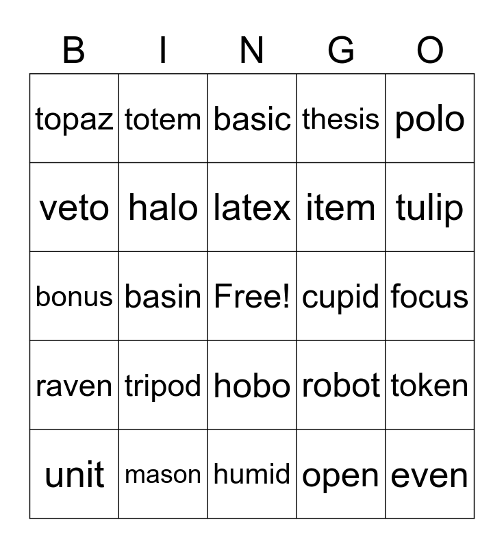 This bingo card has a free space and 24 words: tripod, mason, latex, unit, polo, topaz, veto, totem, cupid, hobo, item, bonus, robot, token, halo, open, focus, basic, tulip, basin, even, raven, thesis and humid.