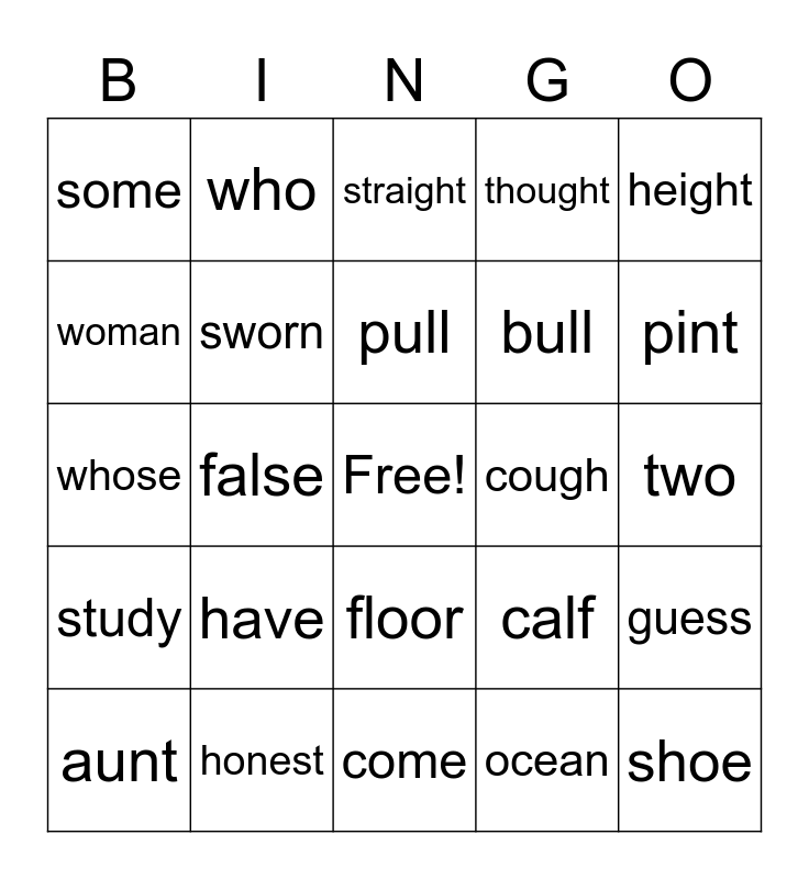This bingo card has a free space and 98 words: the, once, too, two, four, does, don't, gone, were, where, are, said, want, have, live, who, whose, whole, been, both, could, would, should, sure, owe, some, come, such, rich, which, aunt, woman, build, busy, pint, ninth, thought, among, false, move, against, pull, bull, bush, door, floor, pupil, other, pretty, laugh, Wednesday, February, hour, clothes, sew, iron, study, city, copy, odd, egg, folk, heart, stomach, toward, answer, soft, wind, great, steak, straight, walk, ocean, island, view, lose, pear, tear, toward, shoe, wore, sworn, honest, honor, usual, company, blood, debt, guess, guest, guide, calf, wolf, rough, cough, enough, height and journey.