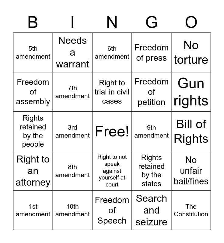 This bingo card has a free space and 29 words: 1st amendment, 2nd amendment, 3rd amendment, 4th amendment, 5th amendment, 6th amendment, 7th amendment, 8th amendment, 9th amendment, 10th amendment, Bill of Rights, The Constitution, Freedom of Speech, Search and seizure, Gun rights, Housing of soldiers, Right to not speak against yourself at court, Right to an attorney, No torture, Rights retained by the people, Rights retained by the states, Freedom of religion, Freedom of petition, Freedom of assembly, Freedom of press, Needs a warrant, No unfair bail/fines, Right to trial in civil cases and 10.