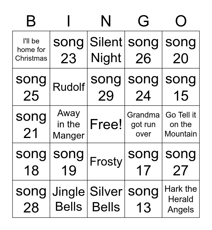 This bingo card has a free space and 30 words: Jingle Bells, White Christmas, Away in the Manger, First Noel, I'll be home for Christmas, Silent Night, Rudolf, Frosty, Grandma got run over, Silver Bells, Go Tell it on the Mountain, Hark the Herald Angels, song 13, song 14, song 15, song 16, song 17, song 18, song 19, song 20, song 21, song 22, song 23, song 24, song 25, song 26, song 27, song 28, song 29 and song 30.