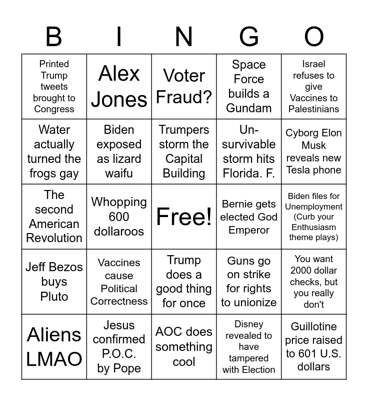 This bingo card has a free space and 24 words: Vaccines cause Political Correctness, Jesus confirmed P.O.C. by Pope, Trumpers storm the Capital Building, Aliens LMAO, Israel refuses to give Vaccines to Palestinians, Printed Trump tweets brought to Congress, Water actually turned the frogs gay, Alex Jones, Bernie gets elected God Emperor, Trump does a good thing for once, Un-survivable storm hits Florida. F., The second American Revolution, Guns go on strike for rights to unionize, You want 2000 dollar checks, but you really don't, Biden exposed as lizard waifu, Disney revealed to have tampered with Election, Biden files for Unemployment (Curb your Enthusiasm theme plays), Voter Fraud?, Cyborg Elon Musk reveals new Tesla phone, Whopping 600 dollaroos, Guillotine price raised to 601 U.S. dollars, Jeff Bezos buys Pluto, Space Force builds a Gundam and AOC does something cool.