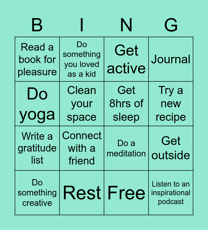 This bingo card has 17 words: Free, Do something creative, Get active, Read a book for pleasure, Connect with a friend, Journal, Get outside, Get 8hrs of sleep, Try a new recipe, Clean your space, Rest, Do a meditation, Do yoga, Do something you loved as a kid, Write a gratitude list, Have a long shower/bath and Listen to an inspirational podcast.