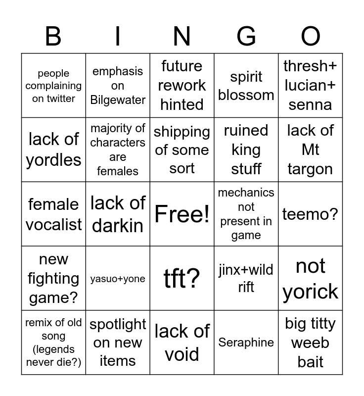 This bingo card has a free space and 24 words: yasuo+yone, spotlight on new items, shipping of some sort, remix of old song (legends never die?), thresh+ lucian+ senna, people complaining on twitter, lack of yordles, emphasis on Bilgewater, mechanics not present in game, tft?, ruined king stuff, female vocalist, jinx+wild rift, not yorick, majority of characters are females, Seraphine, teemo?, future rework hinted, lack of Mt targon, lack of darkin, big titty weeb bait, new fighting game?, spirit blossom and lack of void.
