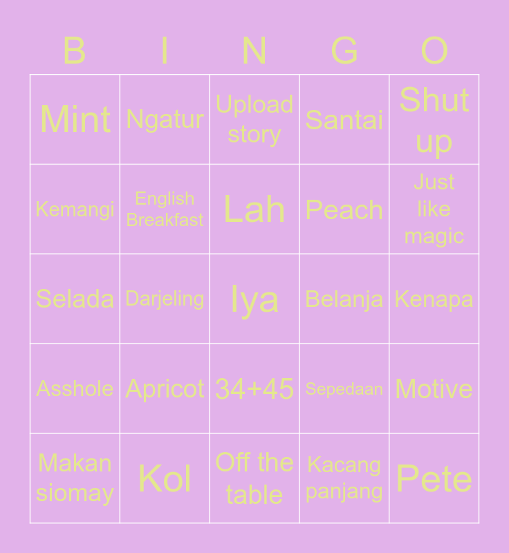 This bingo card has a free space and 24 words: Apricot, Kol, Lah, Makan siomay, Shut up, Mint, Kemangi, Ngatur, Belanja, 34+45, Peach, Selada, Sepedaan, Motive, English Breakfast, Kacang panjang, Kenapa, Upload story, Just like magic, Darjeling, Pete, Asshole, Santai and Off the table.