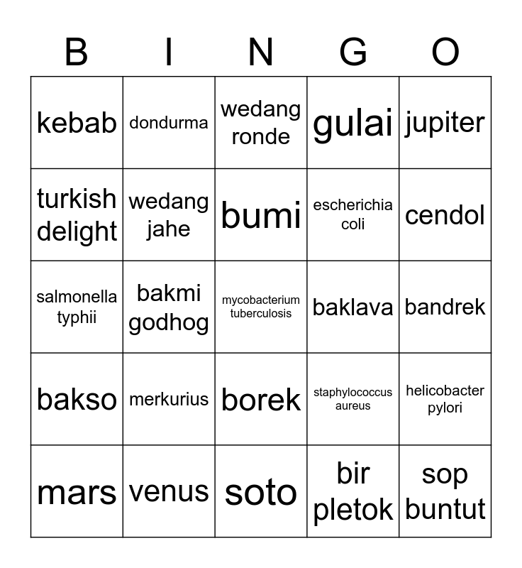 This bingo card has a free space and 24 words: merkurius, venus, bumi, mars, jupiter, kebab, turkish delight, dondurma, baklava, borek, escherichia coli, salmonella typhii, staphylococcus aureus, helicobacter pylori, wedang jahe, bir pletok, bandrek, wedang ronde, cendol, bakmi godhog, sop buntut, bakso, gulai and soto.