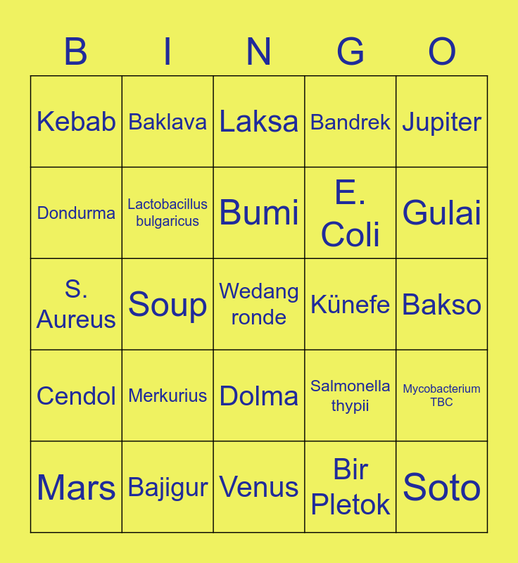 This bingo card has 25 words: Merkurius, Venus, Bumi, Mars, Jupiter, Kebab, Dondurma, Baklava, Künefe, Dolma, E. Coli, S. Aureus, Salmonella thypii, Mycobacterium TBC, Lactobacillus bulgaricus, Soto, Bakso, Laksa, Gulai, Soup, Wedang ronde, Bajigur, Cendol, Bandrek and Bir Pletok.