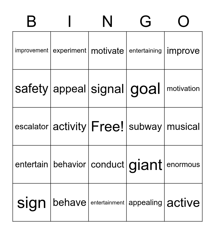 This bingo card has a free space and 24 words: behavior, behave, signal, sign, improve, improvement, safety, experiment, subway, conduct, goal, escalator, giant, enormous, appeal, appealing, musical, motivate, motivation, activity, active, entertain, entertaining and entertainment.