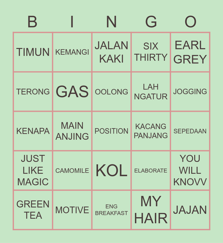 This bingo card has 25 words: CAMOMILE, ENG BREAKFAST, OOLONG, GREEN TEA, EARL GREY, TIMUN, TERONG, KEMANGI, KACANG PANJANG, KOL, LAH NGATUR, KENAPA, ELABORATE, YOU WILL KNOVV, GAS, JAJAN, SEPEDAAN, JALAN KAKI, JOGGING, MAIN ANJING, POSITION, MOTIVE, JUST LIKE MAGIC, SIX THIRTY and MY HAIR.