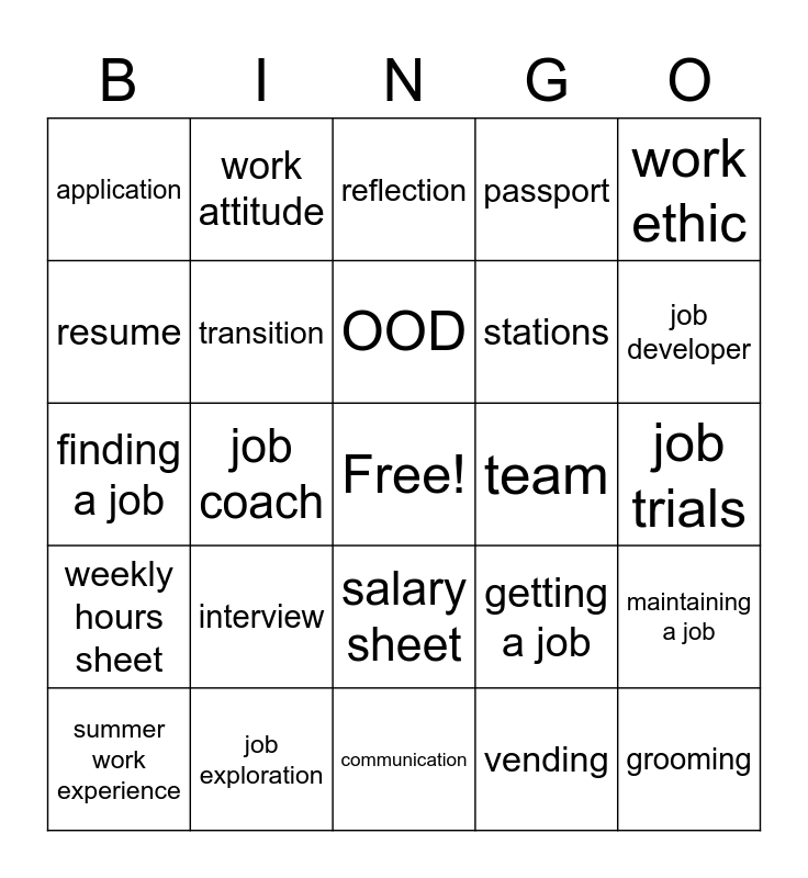 This bingo card has a free space and 24 words: interview, job exploration, OOD, summer work experience, work ethic, application, resume, work attitude, team, salary sheet, stations, finding a job, getting a job, maintaining a job, transition, vending, job trials, reflection, job developer, job coach, grooming, weekly hours sheet, passport and communication.