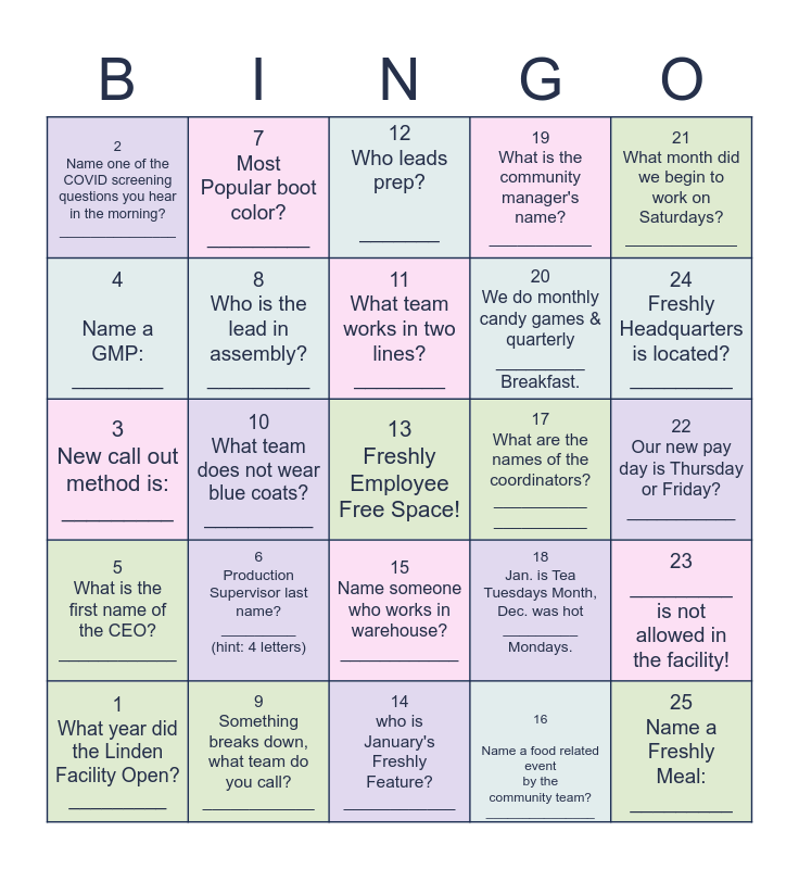 This bingo card has a free space and 24 words: 1 What year did the Linden Facility Open? _________, 6 Production Supervisor last name? _________ (hint: 4 letters), 11 What team works in two lines? ________, 16 Name a food related event by the community team? _______________, 21 What month did we begin to work on Saturdays? ____________, 2 Name one of the COVID screening questions you hear in the morning? _______________, 7 Most Popular boot color? _________, 12 Who leads prep? _______, 17 What are the names of the coordinators? __________ __________, 22 Our new pay day is Thursday or Friday? ___________, 3 New call out method is: _________, 8 Who is the lead in assembly? _________, 18 Jan. is Tea Tuesdays Month, Dec. was hot _________ Mondays., 23 _________ is not allowed in the facility!, 4 Name a GMP: ________, 9 Something breaks down, what team do you call? ____________, 14 who is January's Freshly Feature? ____________, 19 What is the community manager's name? ___________, 24 Freshly Headquarters is located? _________, 5 What is the first name of the CEO? ____________, 10 What team does not wear blue coats? __________, 15 Name someone who works in warehouse? ____________, 20 We do monthly candy games & quarterly _________ Breakfast. and 25 Name a Freshly Meal: _________.