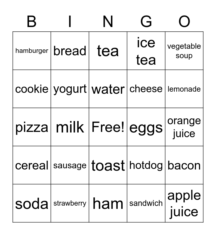 This bingo card has a free space and 24 words: sausage, strawberry, water, soda, vegetable soup, hamburger, cookie, bread, eggs, toast, cheese, pizza, hotdog, bacon, yogurt, sandwich, orange juice, tea, lemonade, milk, apple juice, cereal, ice tea and ham.