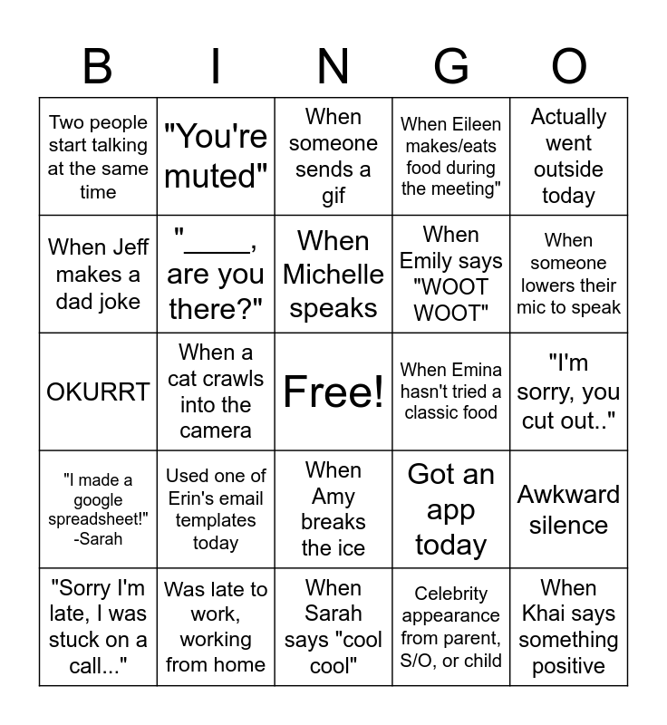 This bingo card has a free space and 28 words: Awkward silence, When Anna speaks, When Emily says "WOOT WOOT", Celebrity appearance from parent, S/O, or child, When Jeff makes a dad joke, When someone sends a gif, "You're muted", "I made a google spreadsheet!" -Sarah, When Emina hasn't tried a classic food, "Sorry I'm late, I was stuck on a call...", OKURRT, When Eileen makes/eats food during the meeting", Was late to work, working from home, When Sarah says "cool cool", When someone lowers their mic to speak, Ordered takeout food, Used one of Erin's email templates today, "____, are you there?", When Michelle speaks, When Amy breaks the ice, Two people start talking at the same time, When Alexis takes a sip of water, When Khai says something positive, When a cat crawls into the camera, "I'm sorry, you cut out..", Got an app today, Actually went outside today and "You're muted".