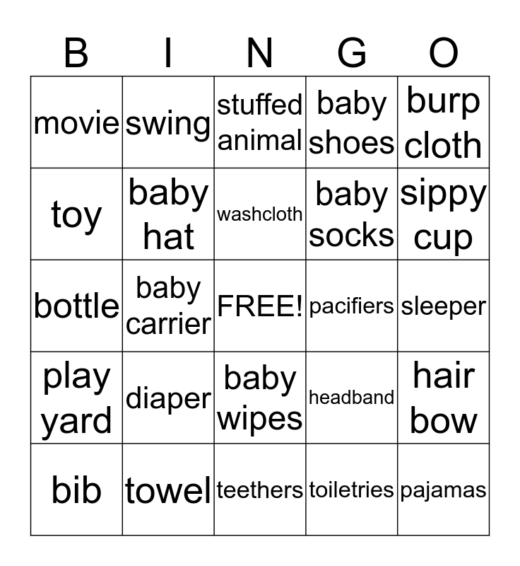 This bingo card has a free space and 24 words: diaper, towel, washcloth, bib, burp cloth, movie, toy, swing, pacifiers, baby wipes, baby socks, bottle, headband, hair bow, baby hat, toiletries, sleeper, stuffed animal, sippy cup, baby carrier, pajamas, play yard, baby shoes and teethers.