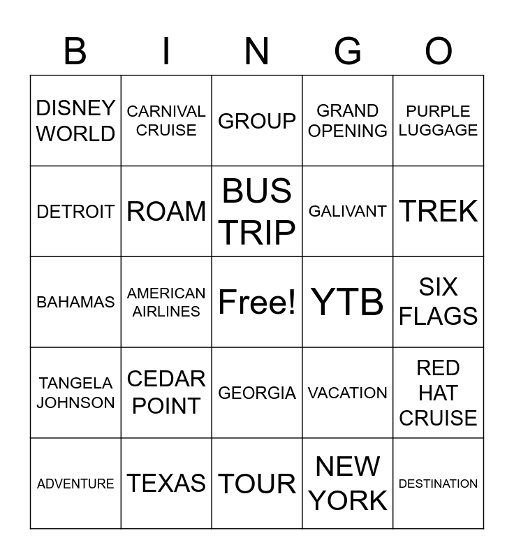 This bingo card has a free space and 29 words: PARIS, TEXAS, GROUP, LAS VEGAS, PURPLE LUGGAGE, DISNEY WORLD, ROAM, BUS TRIP, YTB, RED HAT CRUISE, ADVENTURE, AMERICAN AIRLINES, NEW YORK, DESTINATION, BAHAMAS, ROYAL CARIBBEAN, TOUR, VACATION, TREK, TANGELA JOHNSON, CEDAR POINT, JAMAICA, GALIVANT, SIX FLAGS, DETROIT, CARNIVAL CRUISE, GEORGIA, GRAND OPENING and TRAVEL AGENT.