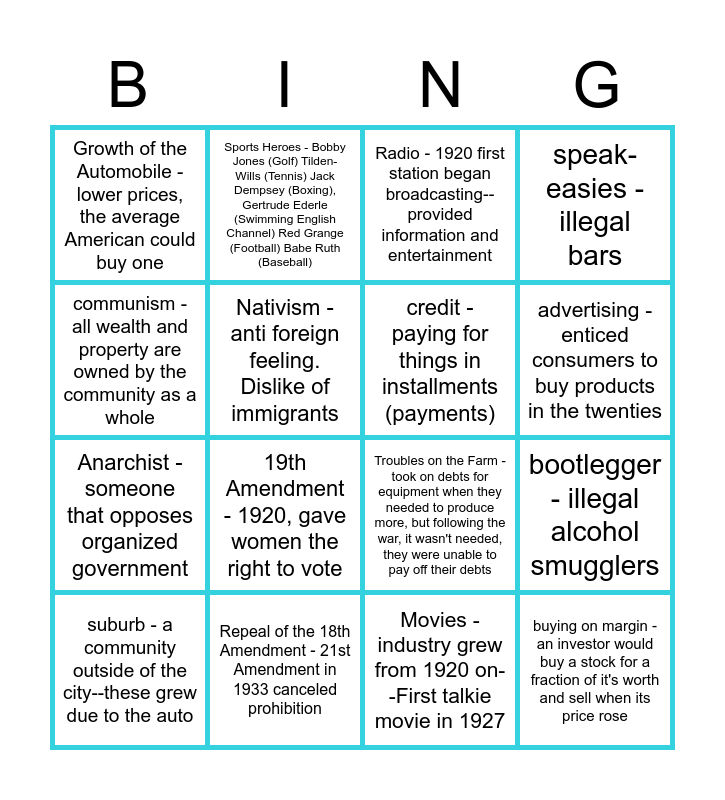 This bingo card has 36 words: Warren G Harding - President after Wilson, pro business, Teapot Dome Sandal, died in office, Teapot Dome Scandal - Oil execs bribed interior secretary and got government land in return. Scandal under Harding's administration, Calvin Coolidge - President after Harding, economy grew, consumer goods grew, credit - paying for things in installments (payments), stocks - shares of ownership in a corporation, buying on margin - an investor would buy a stock for a fraction of it's worth and sell when its price rose, advertising - enticed consumers to buy products in the twenties, isolationism - the US returned to isolationism after WWI, communism - all wealth and property are owned by the community as a whole, Prohibition - 18th Amendment 1919, banned the manufacturing, sale, and transportation of liquor in the US, bootlegger - illegal alcohol smugglers, speak-easies - illegal bars, organized crime - professional criminals or gangsters earned big money providing society alcohol, Repeal of the 18th Amendment - 21st Amendment in 1933 canceled prohibition, 19th Amendment - 1920, gave women the right to vote, Growth of the Automobile - lower prices, the average American could buy one, Henry Ford - Introduced the assembly line for his Model T, Impact of the Automobile - auto and supporting industry helped to grow the economy, suburb - a community outside of the city--these grew due to the auto, Radio - 1920 first station began broadcasting--provided information and entertainment, Movies - industry grew from 1920 on--First talkie movie in 1927, flapper - young women rebelling against traditional ways--bobbed hair, cigarettes, drinking, The Jazz Age - music started in New Orleans, F. Scott Fitzgerald - writer--the Great Gatsby, Harlem Renaissance - rebirth of African American Culture--Harlem was a part of NYC, Sports Heroes - Bobby Jones (Golf) Tilden-Wills (Tennis) Jack Dempsey (Boxing), Gertrude Ederle (Swimming English Channel) Red Grange (Football) Babe Ruth (Baseball), Troubles on the Farm - took on debts for equipment when they needed to produce more, but following the war, it wasn't needed, they were unable to pay off their debts, Red Scare - Fear of communism. Government took hard action against "Reds", Anarchist - someone that opposes organized government, Nativism - anti foreign feeling. Dislike of immigrants, Scopes Trial - John Scopes wanted to teach Darwin's theory of evolution, but it was against the law, KKK - Ku Klux Klan--Against Blacks, Jews, Catholics. Used terror to control them, Great Migration - Blacks moved north for work,--caused more race issues in the north, Marcus Garvey - shocked by racism, moved for a black nationalist movement--focused on racial pride, Herbert Hoover - President after Coolidge, believed in Rugged Individualism and Eugenics - the science of improving a human population by controlled breeding.