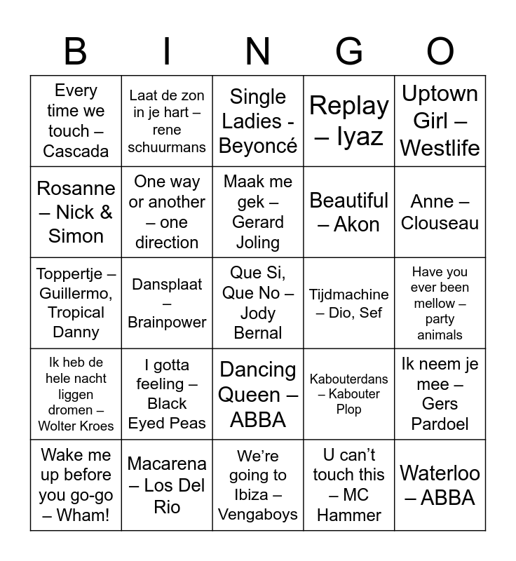 This bingo card has a free space and 96 words: Free!, Het is een nacht – Guus Meeuwis, Casanova – Ultimate Kaos, Tijdmachine – Dio, Sef, Rainbow in the sky – Paul Elstak, Fuifje – DoeMaarDave, Links Rechts – Snollebollekes, Viva La Vida – Coldplay, Crazy in love - Beyoncé, Jay-Z, Got 2 Luv U – Sean Paul, Thrift Shop – Macklemore, Dromendans – Vinzzent, Rood – Marco Borsato, Anne – Clouseau, Love generation – Bob Sinclar, Rosanne – Nick & Simon, Maak me gek – Gerard Joling, Oya Lélé - K3, Ademnood – Linda Roos en Jessica, Stupid – Tess, Leef - André Hazes, Wannabe – Spice Girls, Barbie Girl – Aqua, I want it that way – Backstreetboys, Dancing Queen – ABBA, We’re going to Ibiza – Vengaboys, 1001 Arabian Nights – Chipz, Every time we touch – Cascada, Dromen zijn bedrog – Marco Borsato, Zij weet het – Tino Martin, Dragostea din tei – O-Zone, Kabouterdans – Kabouter Plop, Cotton Eye Joe – Rednex, The ketchup Song – Las Ketchup, Uptown Girl – Westlife, Step Right Up – Jamai, Ik neem je mee – Gers Pardoel, Mambo No. 5 – Lou Bega, It wasn’t me – Shaggy, Dansplaat – Brainpower, Africa – TOTO, Wake me up before you go-go – Wham!, Waterloo – ABBA, Macarena – Los Del Rio, Ik heb de hele nacht liggen dromen – Wolter Kroes, Single Ladies - Beyoncé, Dura – Daddy Yankee, Even aan mijn moeder vragen – Bloem, Hero – Enrique Iglesias, Temperature – Sean Paul, What makes you beautiful – One Direction, What is love – Haddaway, Walk on water – Milk Inc., Narcotic – Liquido, Alane – Wes, Thriller – Micheal Jackson, Mysterious Girl – Peter Andre, Let’s get loud – Jennifer Lopez, Bewegen is gezond – kinderen voor kinderen, Jailhouse rock – Elvis Presley, Stayin’Alive - Bee Gees, Get Spanish – Jeugd van tegenwoordig, Ai se eu te pego – Michel Teló, Zij – Marco Borsato, Greased Lightning – John Travolta, Ik wou dat ik jou was – veldhuis en kemper, Rhytm is a dancer – SNAP!, La bomba – King Africa, Vamos a la playa – miranda, U can’t touch this – MC Hammer, ABC – The Jackson 5, Désenchantée - Kate Ryan, Walking on sunshine – Katrina & the waves, Mi Rowsu – Damaru, Jan smit, The tide is high – Atomic Kitten, Salsa Tequila – Anders Nilsen, September – Earth, wind & fire, One way or another – one direction, Lay all your love on me – ABBA, Beautiful – Akon, Replay – Iyaz, Unwritten – Natasha Bedingfield, Country Roads – Hermes Houseband, De Toreador – Opgeblazen, Wilbert Pigmans, Je hoeft niet naar huis vannacht – Marco Borsato, Toppertje – Guillermo, Tropical Danny, I gotta feeling – Black Eyed Peas, Follow the leader – the soca boys, Heb je even voor mij – frans bauer, Have you ever been mellow – party animals, Viva hollandia – wolter kroes, Waka waka – shakira, Just say hello – rene froger, Mamma mia – abba, Laat de zon in je hart – rene schuurmans and Livin' la vida loca – ricky martin.