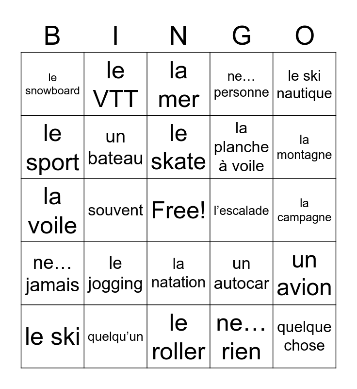 This bingo card has a free space and 25 words: le jogging, le roller, le skate, le ski, le ski nautique, le snowboard, le sport, le VTT, l’escalade, la natation, la planche à voile, la voile, un autocar, un avion, un bateau, un train, la campagne, la mer, la montagne, souvent, quelque chose, quelqu’un, ne… jamais, ne… personne and ne… rien.