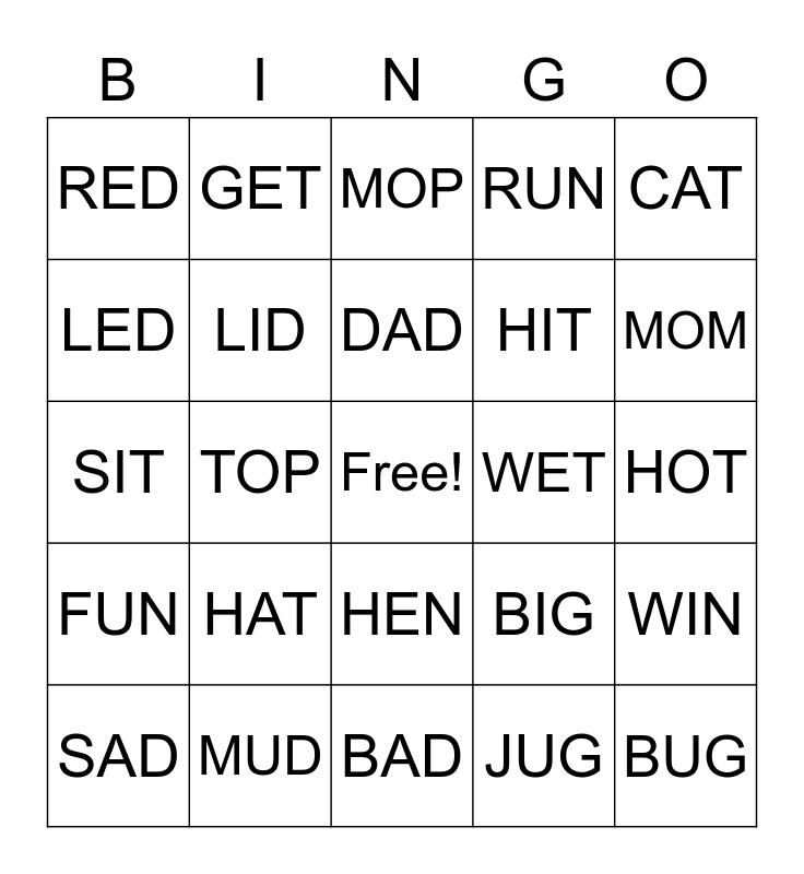 This bingo card has a free space and 25 words: HAT, BAD, DAD, SAD, CAT, RED, LED, GET, WET, HEN, HIT, SIT, BIG, WIN, LID, POT, HOT, MOP, MOM, TOP, BUG, MUD, FUN, RUN and JUG.