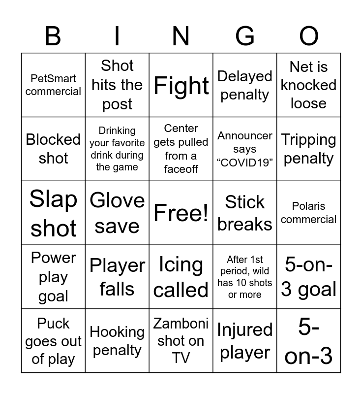 This bingo card has a free space and 43 words: 5-on-4, 5-on-3, Wild Goal, Puck goes out of play, Breakaway, Injured player, Fight, Free, Net is knocked loose, Hooking penalty, Delayed penalty, Stick breaks, Icing called, Player falls, Video goal review, Zamboni shot on TV, Offside, Slap shot, High sticking penalty, Tripping penalty, Shot hits the post, Toyota commercial, Xcel Energy commercial, PetSmart commercial, TRIA commercial, Polaris commercial, Defenseman scores, Talbot makes over 20 saves, After 1st period, wild has 10 shots or more, Power play goal, 5-on-4 goal, 5-on-3 goal, Wild kill first penalty, Glove save, Goalie gets pulled, Empty net goal, Penalty for too many men on the ice, Center gets pulled from a faceoff, Blocked shot, Announcer says “COVID19”, Announcer says “bubble”, Drinking your favorite drink during the game and Wearing Wild gear.