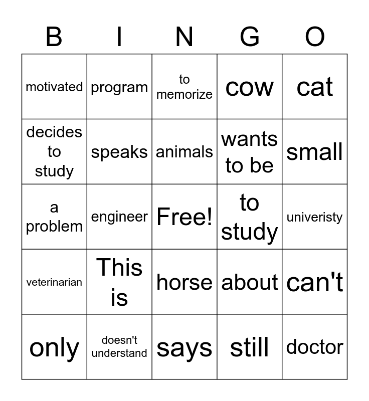 This bingo card has a free space and 24 words: This is, doesn't understand, animals, only, cat, motivated, decides to study, program, to study, horse, wants to be, a problem, about, can't, speaks, still, univeristy, to memorize, small, engineer, doctor, veterinarian, cow and says.