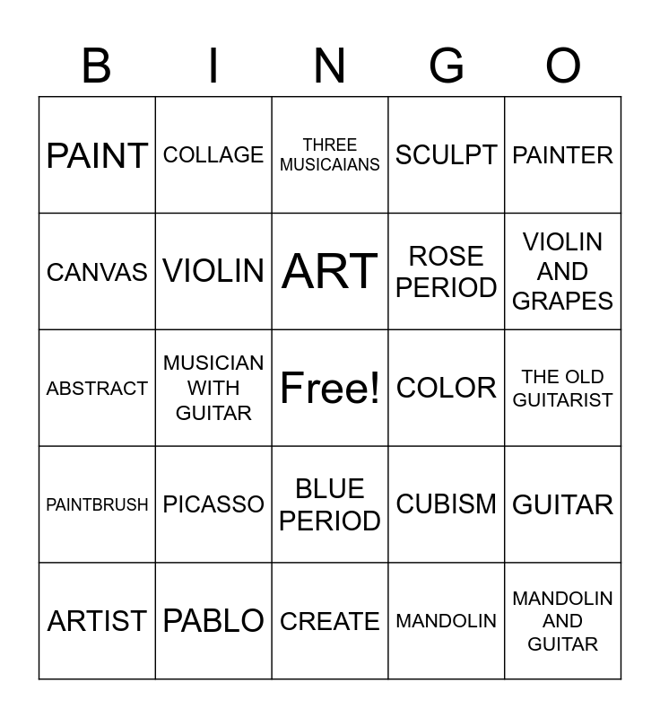This bingo card has a free space and 24 words: PICASSO, PABLO, ART, ARTIST, PAINTER, PAINT, CANVAS, COLLAGE, COLOR, BLUE PERIOD, ROSE PERIOD, ABSTRACT, CUBISM, GUITAR, VIOLIN, MANDOLIN, THE OLD GUITARIST, THREE MUSICAIANS, VIOLIN AND GRAPES, MUSICIAN WITH GUITAR, MANDOLIN AND GUITAR, PAINTBRUSH, SCULPT and CREATE.