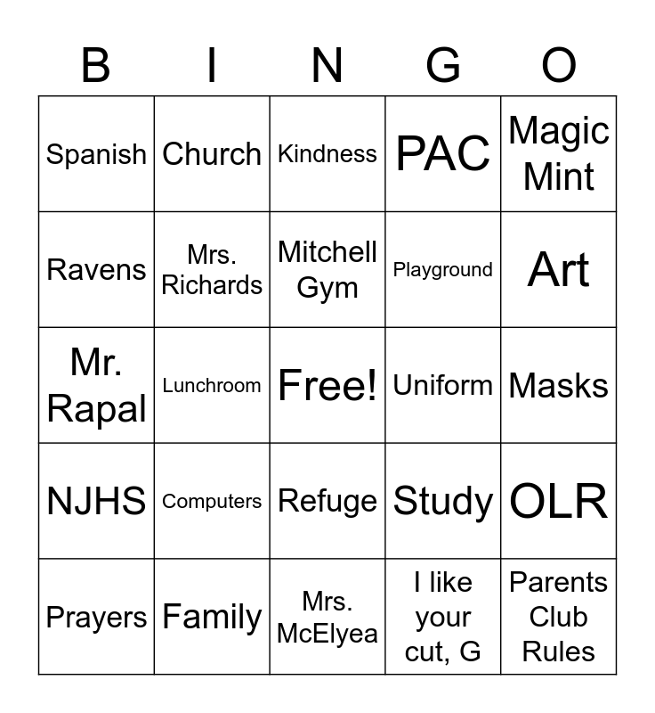 This bingo card has a free space and 29 words: Prayers, Music, Lunchroom, Friends, Spanish, Kindness, Mrs. Richards, Computers, Uniform, Family, Masks, Parents Club Rules, Mrs. McElyea, I like your cut, G, Art, Books, Refuge, NJHS, Magic Mint, Mr. Rapal, Study, Media Center Rocks, Playground, Ravens, PAC, Church, OLR, Mitchell Gym and SUS.