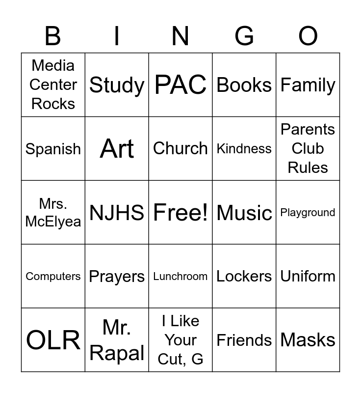 This bingo card has a free space and 29 words: OLR, Sus, NJHS, Magic Mint, Media Center Rocks, PAC, Art, Prayers, Music, Mr. Rapal, Playground, Masks, I Like Your Cut, G, Friends, Parents Club Rules, Mrs. Richards, Lunchroom, Computers, Family, Mrs. McElyea, Lockers, Mitchell Gym, Kindness, Spanish, Books, Study, Uniform, Church and Refuge.