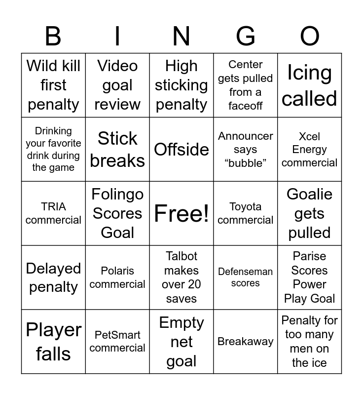 This bingo card has a free space and 34 words: Puck goes out of play, Breakaway, Net is knocked loose, Hooking penalty, Delayed penalty, Stick breaks, Icing called, Player falls, Video goal review, Zamboni shot on TV, Offside, High sticking penalty, Tripping penalty, Shot hits the post, Toyota commercial, Xcel Energy commercial, PetSmart commercial, TRIA commercial, Polaris commercial, Defenseman scores, Talbot makes over 20 saves, After 1st period, Wild has 10 shots or more, Wild kill first penalty, Goalie gets pulled, Empty net goal, Penalty for too many men on the ice, Center gets pulled from a faceoff, Announcer says “COVID19”, Announcer says “bubble”, Drinking your favorite drink during the game, Wearing Wild gear, Folingo Scores Goal, Parise Scores Power Play Goal and Suter Penalty.