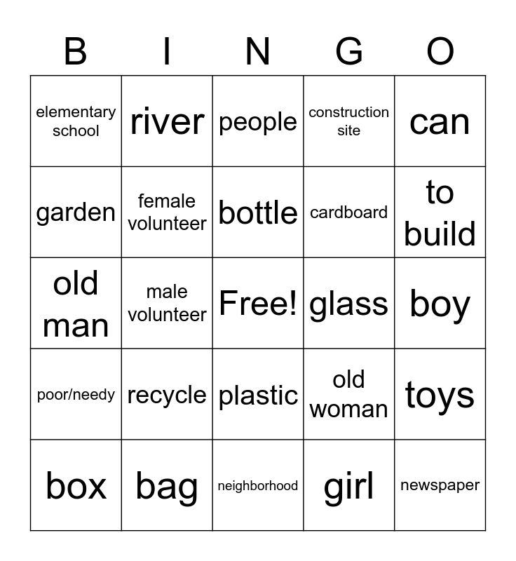 This bingo card has a free space and 24 words: recycle, bag, bottle, box, can, elementary school, garden, river, glass, plastic, cardboard, old man, old woman, toys, female volunteer, girl, boy, people, to build, male volunteer, newspaper, poor/needy, construction site and neighborhood.