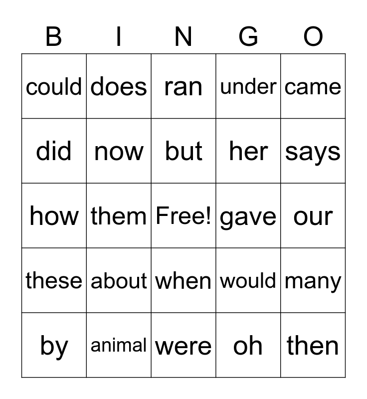 This bingo card has a free space and 24 words: about, animal, but, by, came, could, did, does, gave, when, her, how, would, many, now, oh, our, ran, says, them, then, these, under and were.