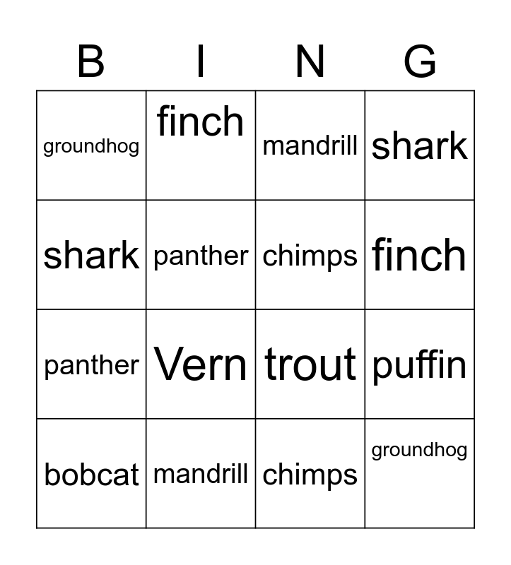 This bingo card has 16 words: mandrill, puffin, mandrill, groundhog, panther, finch, trout, chimps, shark, panther, bobcat, shark, Vern, finch, chimps and groundhog.