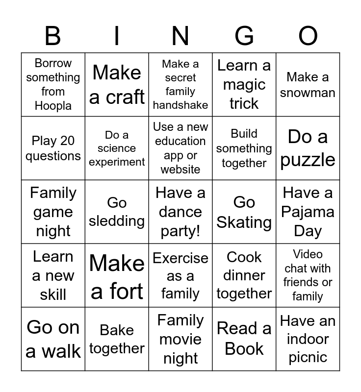 This bingo card has a free space and 24 words: Make a fort, Bake together, Use a new education app or website, Go on a walk, Make a snowman, Borrow something from Hoopla, Play 20 questions, Make a craft, Go Skating, Exercise as a family, Build something together, Family game night, Cook dinner together, Video chat with friends or family, Do a science experiment, Read a Book, Have a Pajama Day, Make a secret family handshake, Do a puzzle, Go sledding, Have an indoor picnic, Learn a new skill, Learn a magic trick and Family movie night.